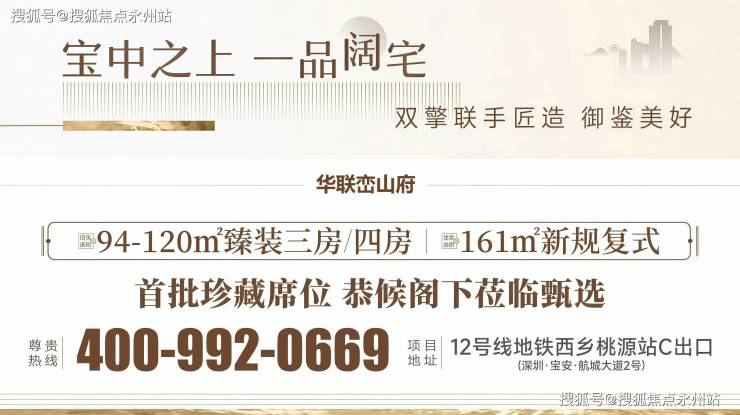华联峦山府是由华联控股与恒裕集团联合开发的高端住宅项目,位于深圳市宝安区航城大道与前进二路交界西北角,地处西乡核心区域,紧邻地铁12号线西乡桃源站 C 出口,交通便利,生态资源丰富。更多项目详情,可拨打我们开发商售楼处电话,24小时VIP热线电话:400-992-0669,中介勿扰,安排现场销售人员为您详细介绍,400-992-0669(已认证)