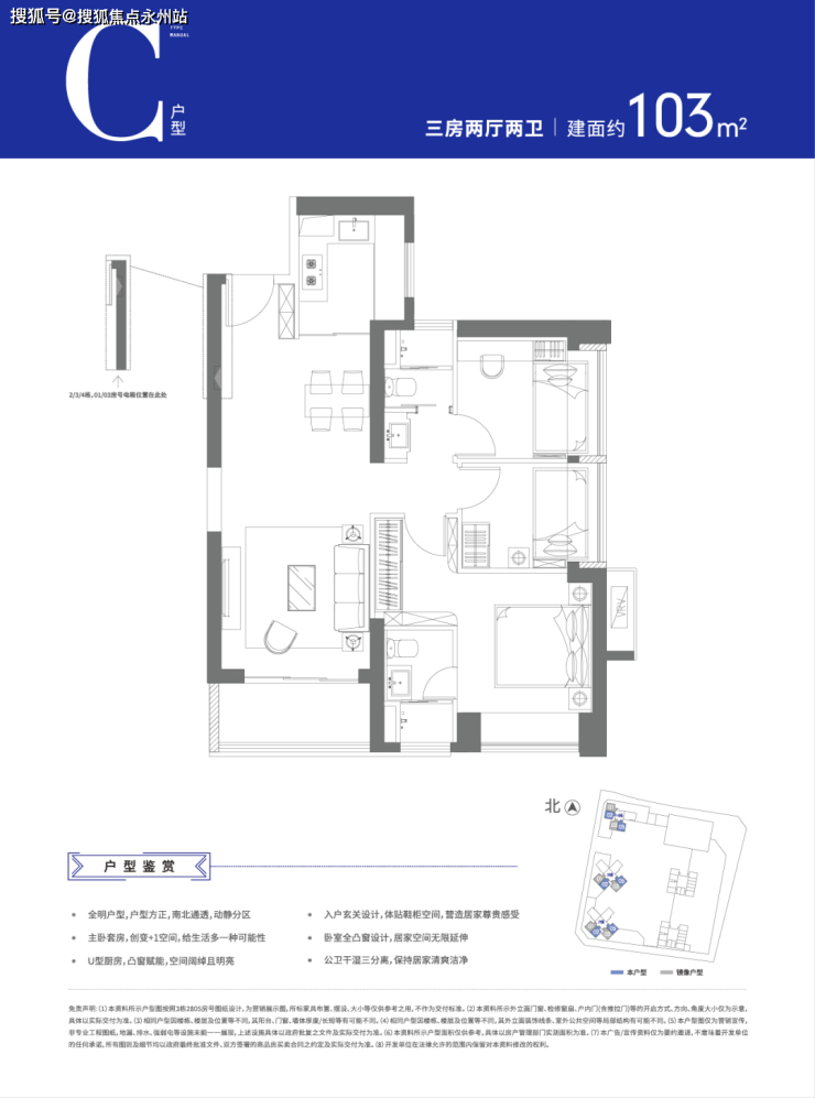 可售户型:103㎡三房两厅两卫、129㎡四房两厅两卫