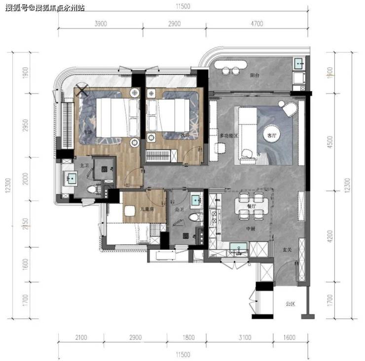 各户型均做到了“半包围式”飘窗赠送:“主卧+衣帽间”转角大飘窗设计,可利用一部分飘窗做衣柜扩大卧室使用面积。次卧、儿童房、卫生间、甚至厨房都有飘窗赠送,给购房者预留了扩展空间。
