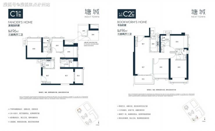 96㎡三房两卫(C1/C2 户型):方正全明南向三房,格局方正,围合设计。