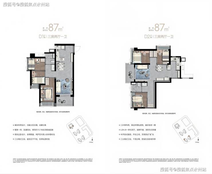87㎡三房一卫(D1/D2 户型):三开间朝南,客厅 3.3 米开间,东南 / 东北朝向,主卧带飘窗,总价 450 万起,满足三口之家需求。