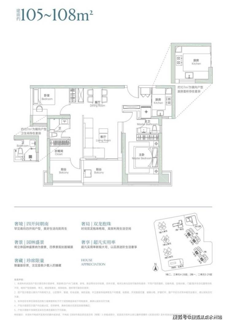 105-108㎡三房两厅两卫:这是项目的入门级户型,采用经典的"双龙抱珠"布局,设计为三房两厅两卫,其中主卧为套房设计,带独立卫生间。
