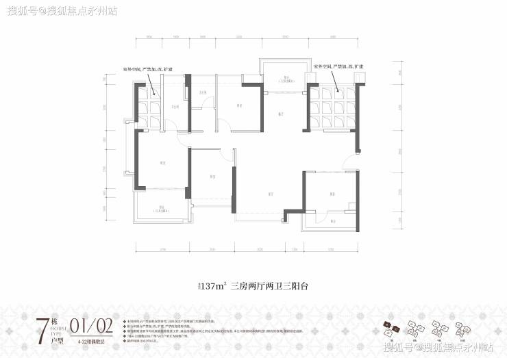 约137㎡三房两卫(7栋01/02户型)双龙抱珠格局,南北通透;奇数层客厅、厨房配有阳台,偶数层餐厅、主卧、厨房都配有阳台,