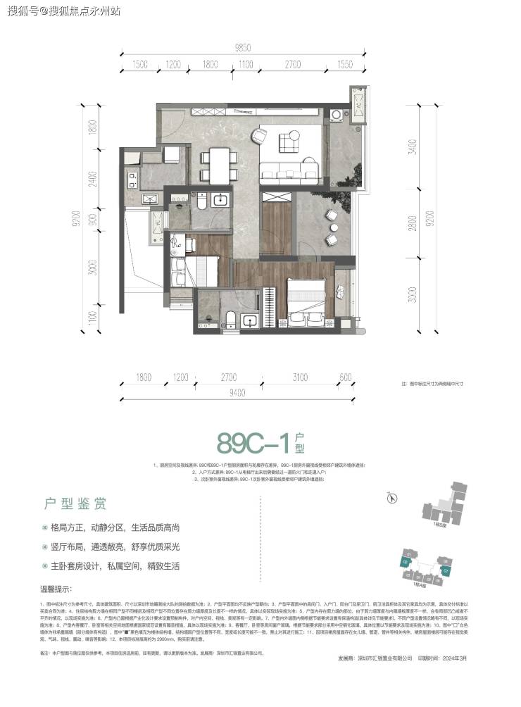 89㎡三室两厅两卫:属于竖厅实用型,格局方正,得房率约90%。三开间朝南,采光通风优越,动静分区合理。U 型厨房设计,操作动线流畅,预留双开门冰箱位,衔接生活阳台。主卧为套房配置,有独立卫浴和飘窗设计,次卧均带飘窗。