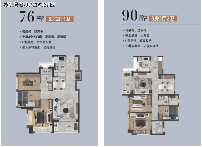 90㎡的3房2厅2卫,设计的是竖厅南北通透格局,仅2栋05户型有,客厅3.6米开间,四开间朝南,全屋飘窗设计,客餐厅错开布局,主卧双飘窗,U型厨房,得房率:77.36%(不含赠送),阳台主朝东南向。