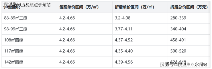 项目备案均价4.58万/㎡,总价区间372-575万,单价区间4.22-5.00万/㎡,折后均价4.14万/㎡,折后总价区间335-520万,折后单价区间3.82-4.52万/㎡。