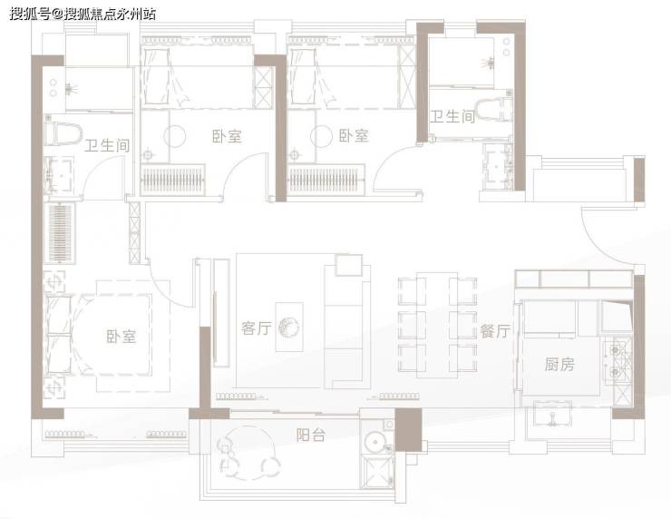 此外,该户型的L型厨房多元功能合理配置,三卧室均带飘窗,大大提高了空间利用率