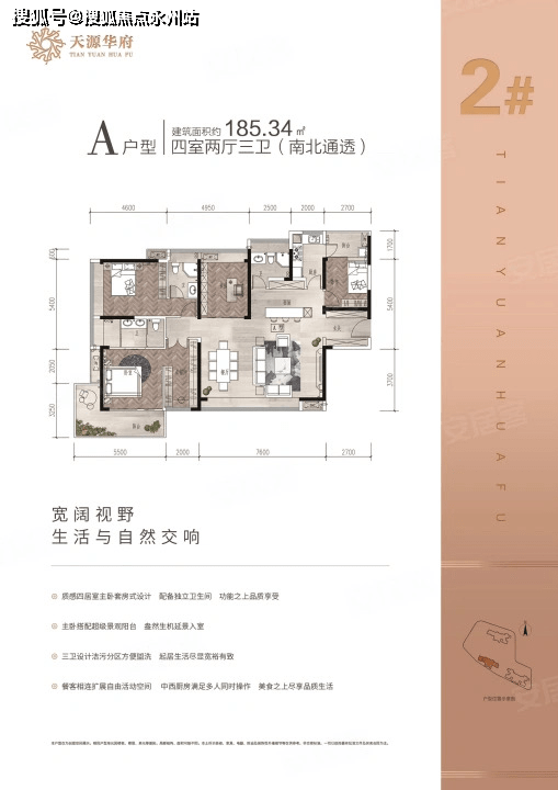 天源华府位于南山中山公园旁,属于景观住宅楼盘,产品面积段为:92-185㎡ 2-4房。此次共有433套住宅,主力户型为建筑面积92.34㎡170套,110.83-114.55㎡多个户型共201套;此外还有185~190㎡62套。整体布局2梯4户,2梯5户为主。