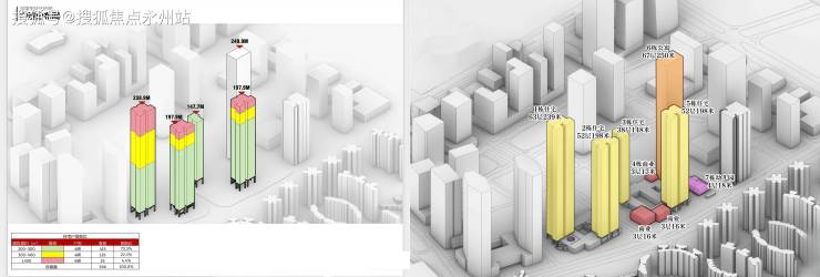 北区:1栋住宅63层约239米,2栋住宅52层约198米;南区:3栋住宅38层约148米,4栋商业3层约17米,5栋住宅52层约198米,6栋商务公寓67层约250米,7栋幼儿园4层约18米,另有两座3层约16米的商业盒子。