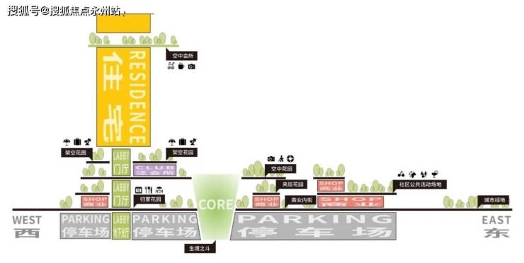 项目分北、南两个地块,由4座住宅+1座公寓+1所幼儿园+3座商业盒子组成,1-2层为商业&配套裙房,3-4层为屋面花园、架空层、会所、设备层,两个地块之间有连廊互通。