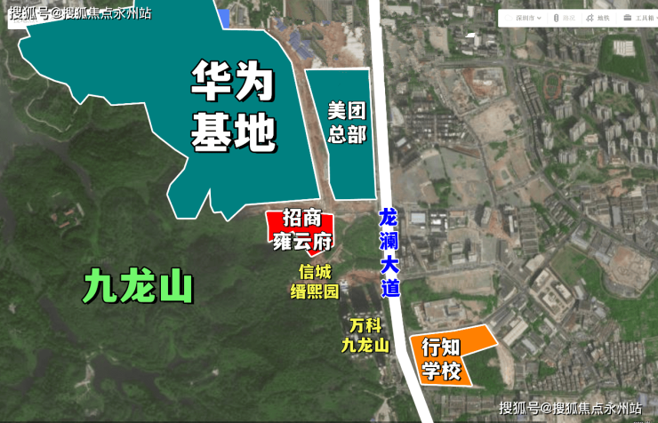 项目位于龙华区福城街道九龙山社区龙澜大道旁,项目西侧紧挨大水坑社区公园;北侧是九龙山智能科技城,华为新基地+美团总部均集结于此,南侧靠近万科九龙山,西侧一大片区域是福城土地整备利益统筹项目,最近的4号地铁线“长湖站”距离约2.8公里。