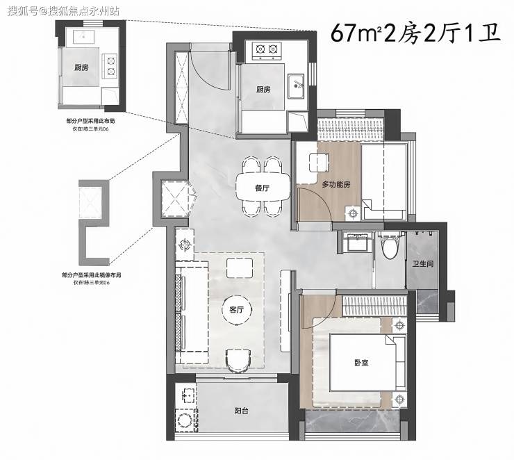 建面约67㎡2房2厅1卫,客厅开间达约3.2米,东南朝向,通风采光好。客餐厅一体化设计,直通阳台,大大提高户型的空间感。