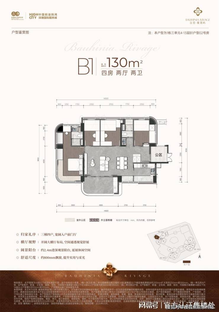 B1户型 (1栋三单元4-13层) 建筑面积约130m²四房两厅两卫,设计亮点包括:三梯四户、横厅布局、约2.4米进深观景阳台及约800毫米飘窗。