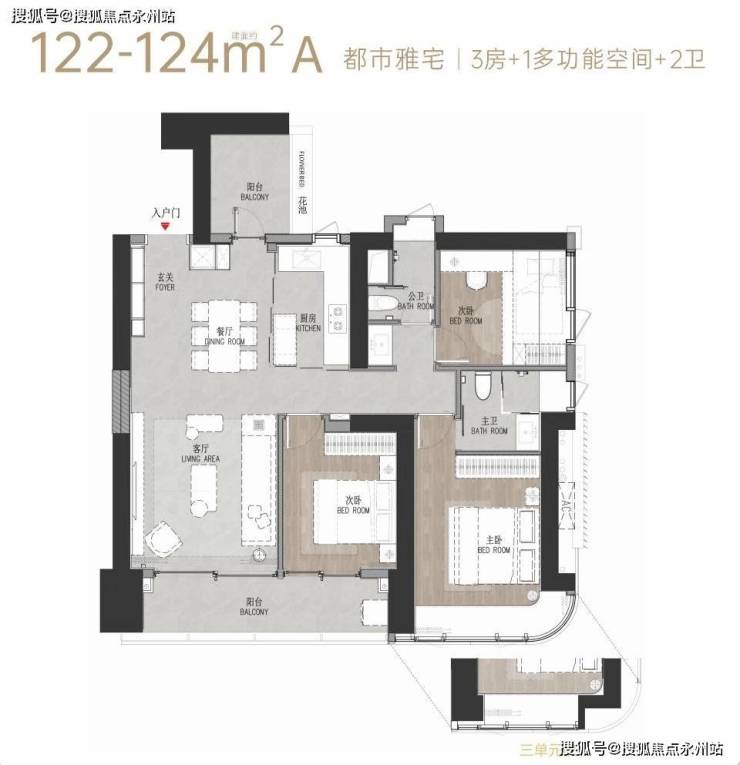 建面约 122-125㎡3+1 房两厅两卫:双套房设计,部分户型东西通透或西北朝向(看绿地公园),中西厨岛台,空间利用率高。