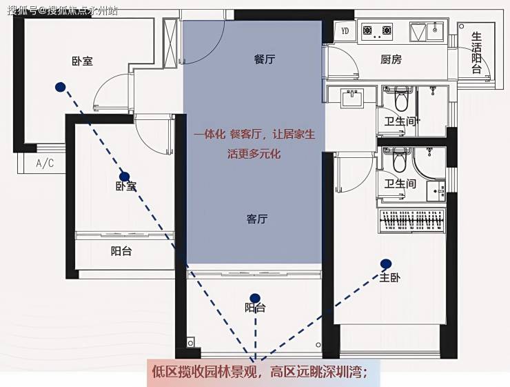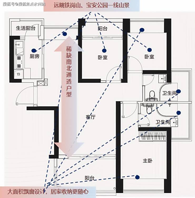 三阳台:前海黄金圈内,唯一在售89㎡三房两卫三阳台,客厅阳台进深2米,堪比140㎡大户型阳台。