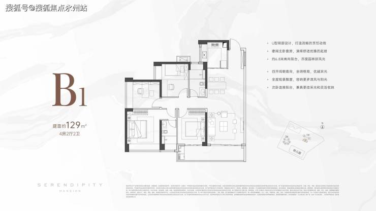 129㎡的4房2厅2卫:分布在1栋的03.04户型,设计的是竖厅格局,客厅3.9米开间,客厅连接次卧出大阳台(6.8米长),三开间朝南,卧室宽度分别为3.5/2.9/2.9/2.9米,U型厨房,卫生间干湿分离,都是西南朝向。