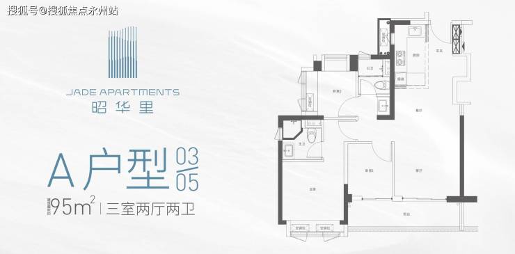 约95㎡三房两卫(1栋03/05户型)竖厅格局,餐客一体,动静分区结构,S型墙预留冰箱位,阳台连接客厅与卧室1,03户型东南朝向,05户型西南朝向。