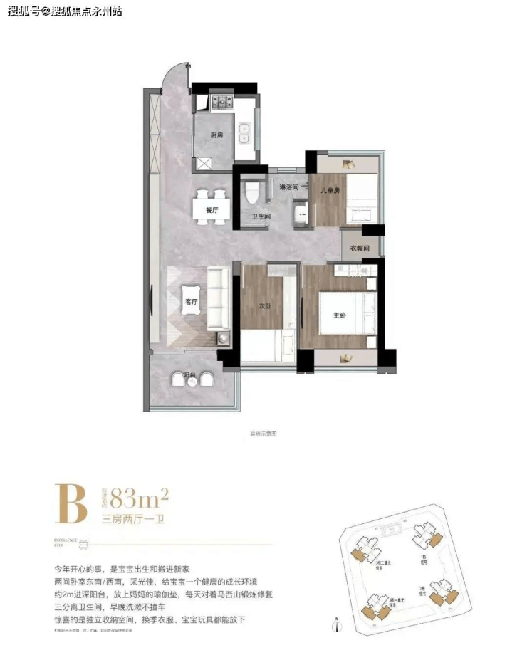 83㎡的3房2厅1卫户型,设计的竖厅格局,客厅3.2米开间,L型厨房,西南及东南朝向。