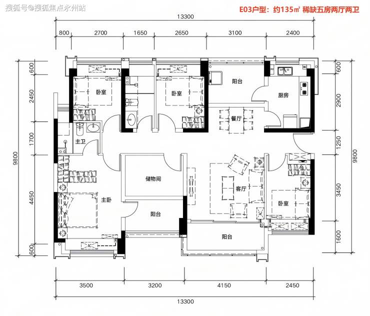 约135㎡五房两厅两卫:四开间朝南,将约2万㎡园林景观尽收眼底,双阳台与方正户型设计,让大宅生活的尊崇与舒适淋漓展现。