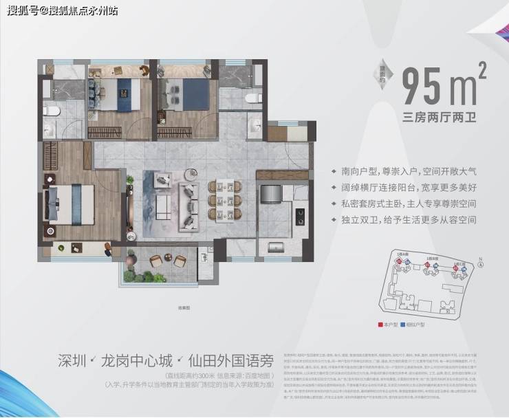 95㎡户型一看就是那种宽敞舒适型的,双卫、入户玄关、横厅、主卧宽敞舒适、两次卧大小均匀,各功能独立性强,这些都是比较讨喜的因素。并且,这个户型的每个卧室也都带有飘窗,利用得当效果更佳。