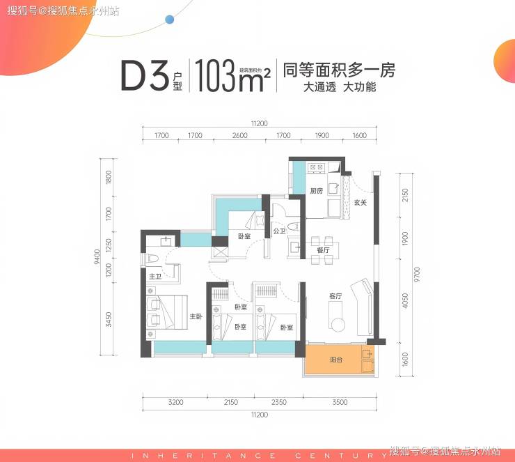 103㎡户型:或为100㎡的变体设计,横厅南北通透,客餐厅开间5.2米,全屋飘窗设计,强调空间灵活性。