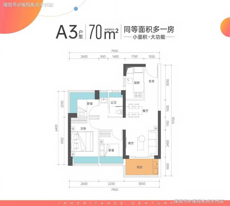 70㎡三房一卫:是项目最小面积段产品,主打高性价比。