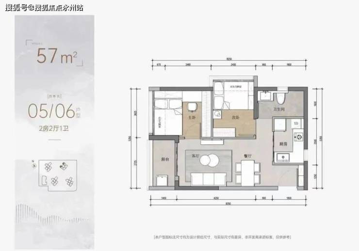 57平2房2厅户型:客厅开间2.75m ,而且还做了一个独立的玄关位,,非常适合小两口刚需上车自住使用,也是卖的最快的一个户型。