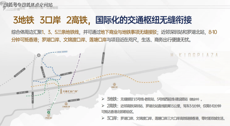 8、罗湖中心地段,3地铁上盖,2高铁,双口岸,举步即达各区:五维立体交通,无缝接驳1/3/5号线,黄金线路贯穿整个城市经济圈。