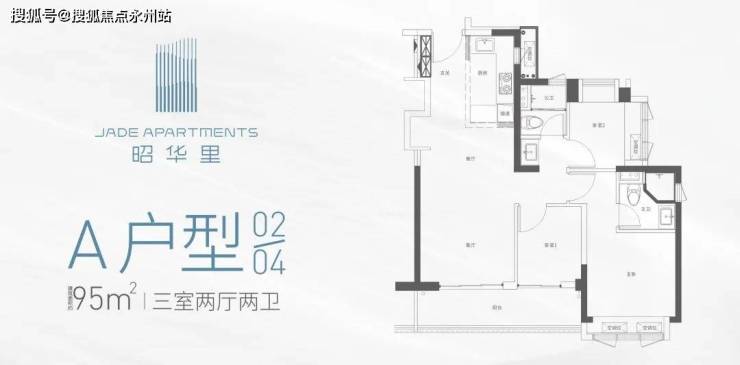 三房两卫的竖厅 95㎡ 户型为三面宽南向,竖厅方正格局。竖厅设计中采用了 LDKB 客厅,使厨房空间可 以双向打开,满足社交型厨房的需求。卧室均采取了满凸窗赠送,使室内有充足的采光与视野。阳台为 5.55m 宽双开间阳台,满足生活起居需求的同时,拓展了南向视野。