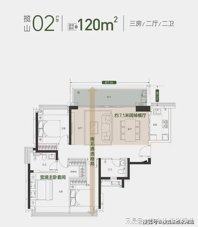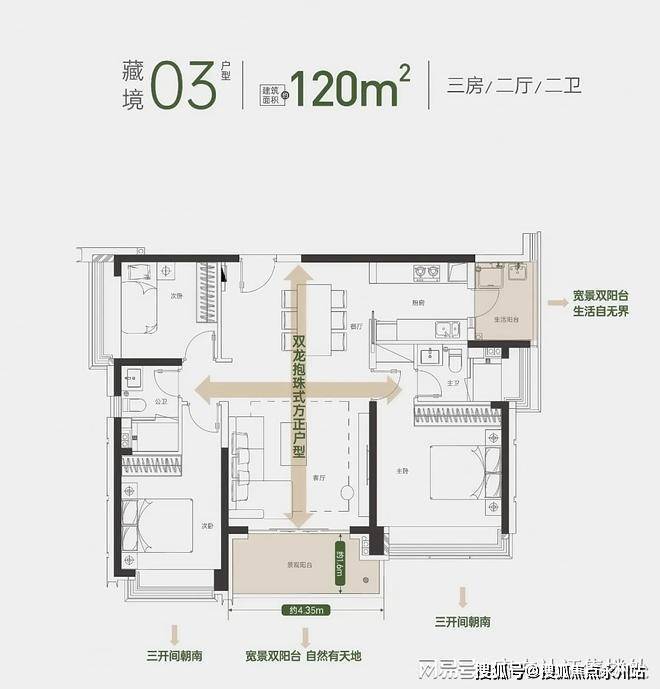 03户型 约120㎡3房2卫:双龙抱珠户型,三开间朝南,双阳台设计,该户型为正南朝向,户型方正,双阳台,三开间朝南,能实现三面宽采光“双龙抱珠”设计的居住格局,中庭为厅,主客卧分布于客厅两侧,在提高空间利用率的同时,也能显著提高居住的私密性,主卧套房设计,带观景浴室,双阳台设计,主阳台进深约1.5米观景阳台,拥有270°向外视野景观,俯瞰安托山,生活阳台连接双面操作厨房,还能看塘朗山景观。