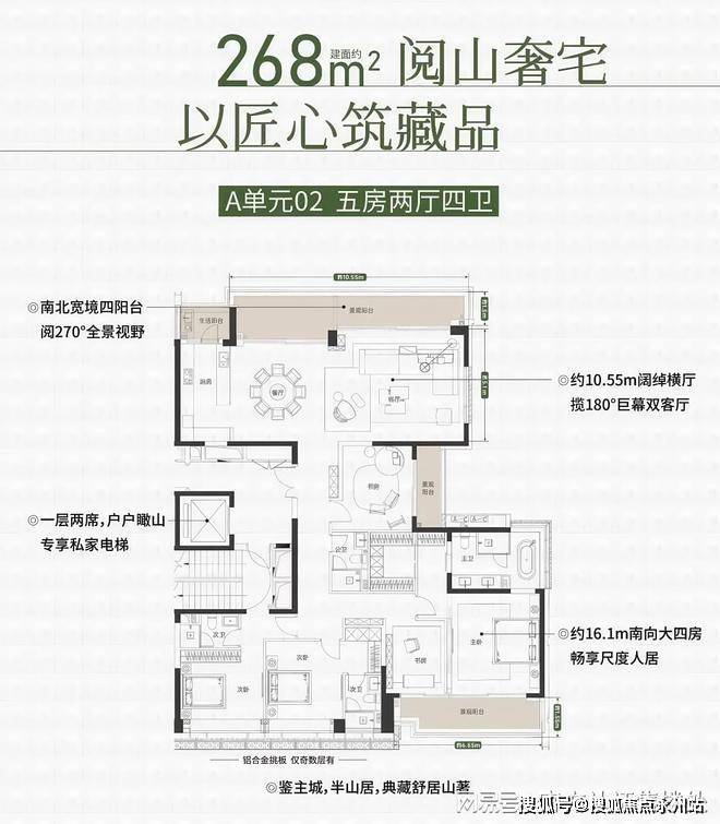 建面约268㎡的大平层户型,为五房四卫三套间设计 ,动静分区,将生活与居住空间相对分隔,全是南北通透的设计,每个卧室都有一个大飘窗,基本是开间有多宽,窗就有多宽,南北四阳台设计,打造270°全景视野 ,将周边景观资源直接引入室内,创造“有限空间见无限景观”的效果,主卧也配置了瞰景阳台,闲暇时刻,与爱人依偎在观景飘窗旁,一杯红酒,闲话密语,繁城万象尽私藏。