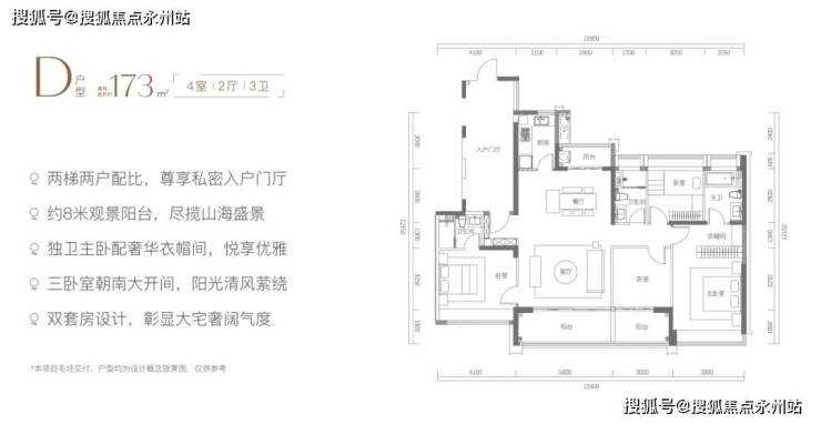 D户型为尊贵四房三卫设计,三卧室南向海景大开间,采用双套房配备私属卫浴设计,主卧配备专属奢华衣帽间,居住体验更为奢华。