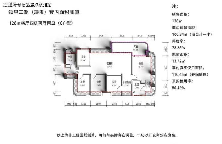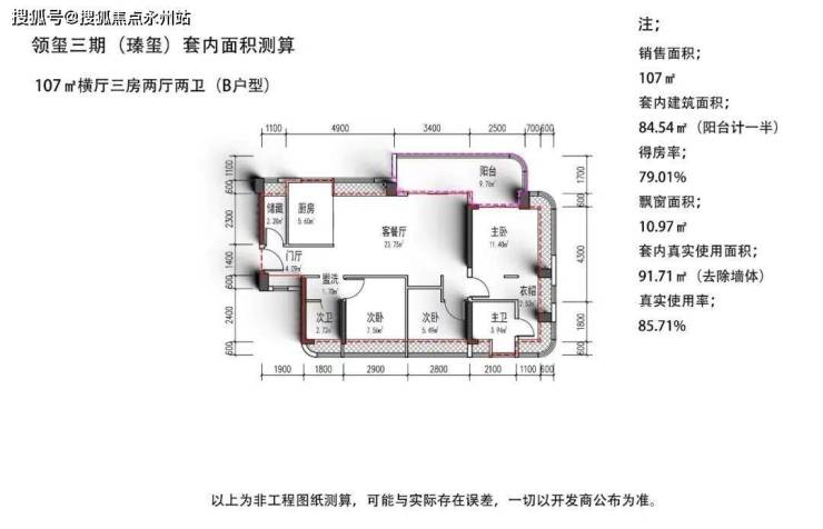 项目约320套房源户型分2个面积段 3种户型,其中106-107㎡ 3房2卫户型约240套,128㎡4房2卫 约80套,赠送后约92%-97%的超高使用率。