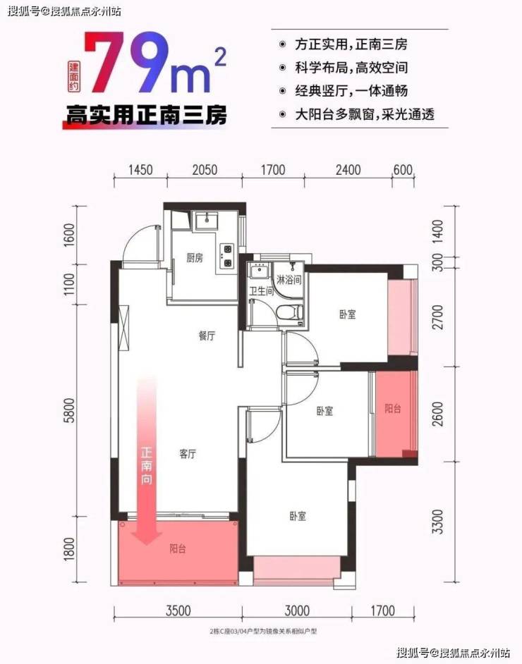 89㎡三房两卫:折后总价360万-383万元(单价约4.04万-4.3万元/㎡),东南朝向双阳台设计。