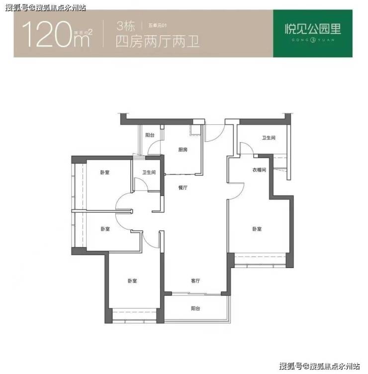 120㎡的4房2厅2卫:仅3栋5单元01户型,设计的是创新式双龙抱珠格局,L型厨房,公卫三段式分离,得房率74.13%(不含赠送),东南朝向。