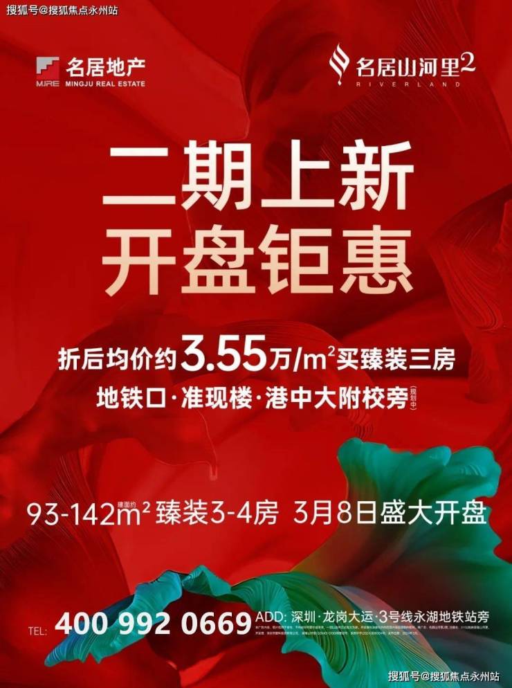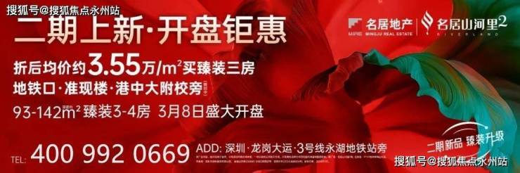 龙岗横岗永湖地铁站200米距离准现房,今年买今年住,名居山河里一期95㎡三房两卫折后总价307万起,120㎡四房两卫折后总价440万起送简装交付!项目楼下九年一贯制用地目前已和香港中文大学签约。目前二期已取证,加推户型为93-142㎡,二期价格已出炉,备案价格最低价格3.87万/平,均价4.3万,项目开盘折扣86折,折后最低3.34万,虽然说二期价格比一期高一点,但是相比一期二期园林更大以及装修升级了,整体算下来二期性价比会更高一些。