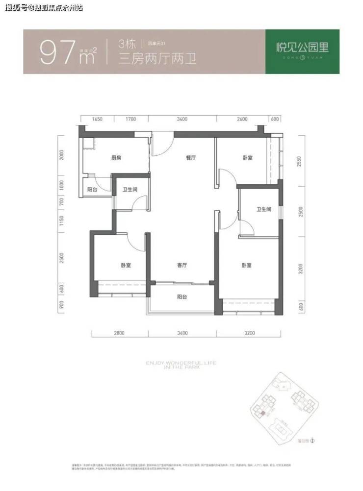 97㎡的3房2厅2卫,仅3栋4单元01户型,设计的是竖厅双龙抱珠格局,客厅3.4米开间,三开间朝南,3个卧室分别做到了3.2米/2.8米/255米的宽度,L型厨房带1个生活阳台,公卫三段式分离,得房率73.61%(不含赠送),东南朝向。