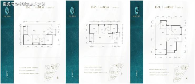 E3户型-80㎡-3房2厅1卫:2栋B座03户型,设计的是竖厅格局,客厅3.5米开间,餐客厅一体化,3个房间宽度分别为3.2/2.8/2.4米,L型厨房,三段式分离卫生间,得房率:90.2%(包含赠送),阳台进深1.4米,东南朝向。