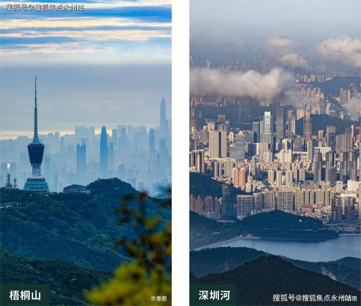项目选址梧桐山下,比邻深圳河,隔空对望香港红花岭,三面环山得天独厚山景资源,南北双向无遮拦视野,户户观山景。