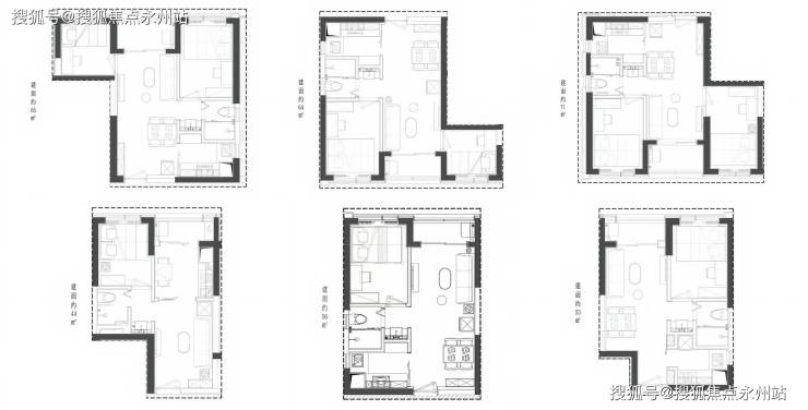 目前在售的商务公寓户型包括44㎡的1房、53-56㎡的1房以及63-65㎡和71㎡的2房2厅1卫。