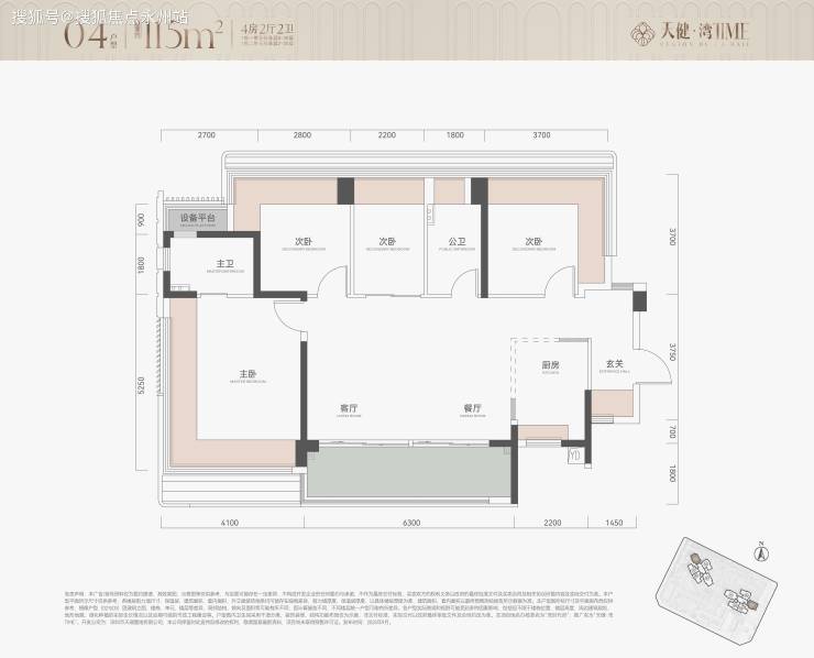 115㎡4房2卫,横厅户型,朝南看海,入户独立玄关,但三个次卧朝北。