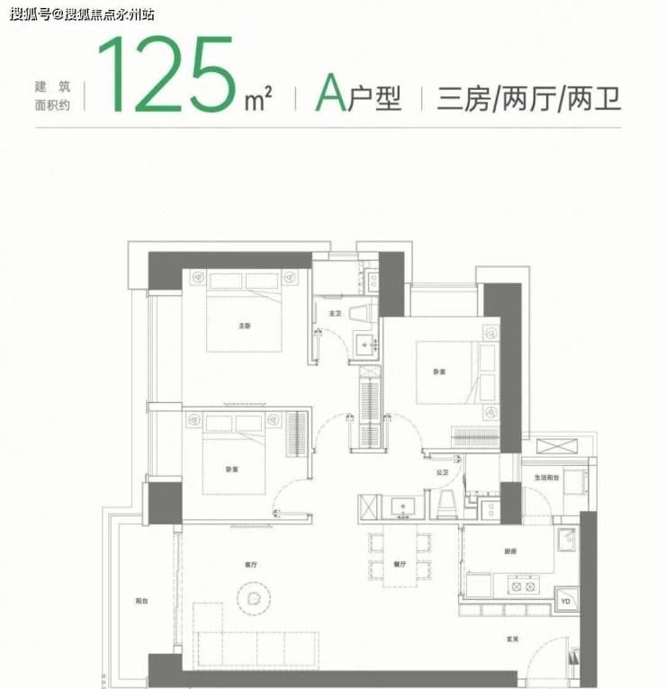 125平三房两卫A户型这是项目最主力的户型,总共646套。这个户型有很多不同朝向,但都在端头位,正向和侧向均有采光,且入户左转入玄关,增加了隐私性的同时,还会有一种豁然开朗之感。