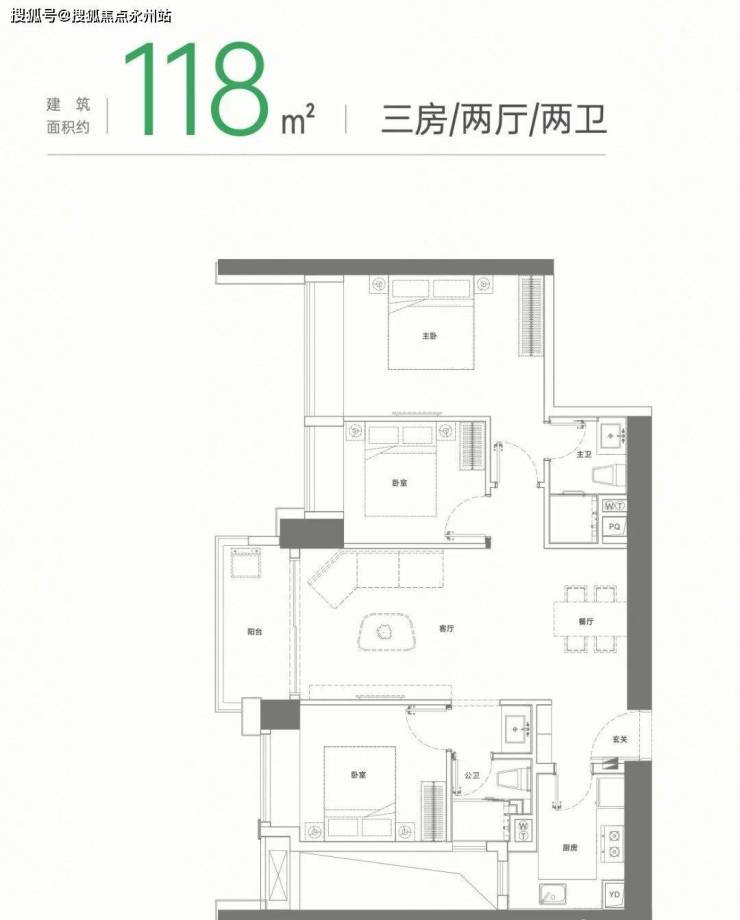 118平三房两卫这个户型采用了双龙抱珠设计,仅有64套,同样做到了客厅卧室同一朝向,且都朝西南,采光面非常足。