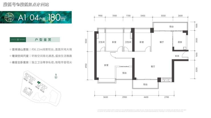 180㎡的4房2厅2卫:设计的是竖厅格局,南北通透双阳台,客厅7.3米大开间,进门入户玄关,4个卧室分别做到了3.65米/3.45米/3.1米/2.9米的宽度,U型厨房,卫生间干湿分离,得房率:72.37%(不含赠送),客厅阳台主朝西南向,餐厅位还有个长6.15米的观景大阳台。