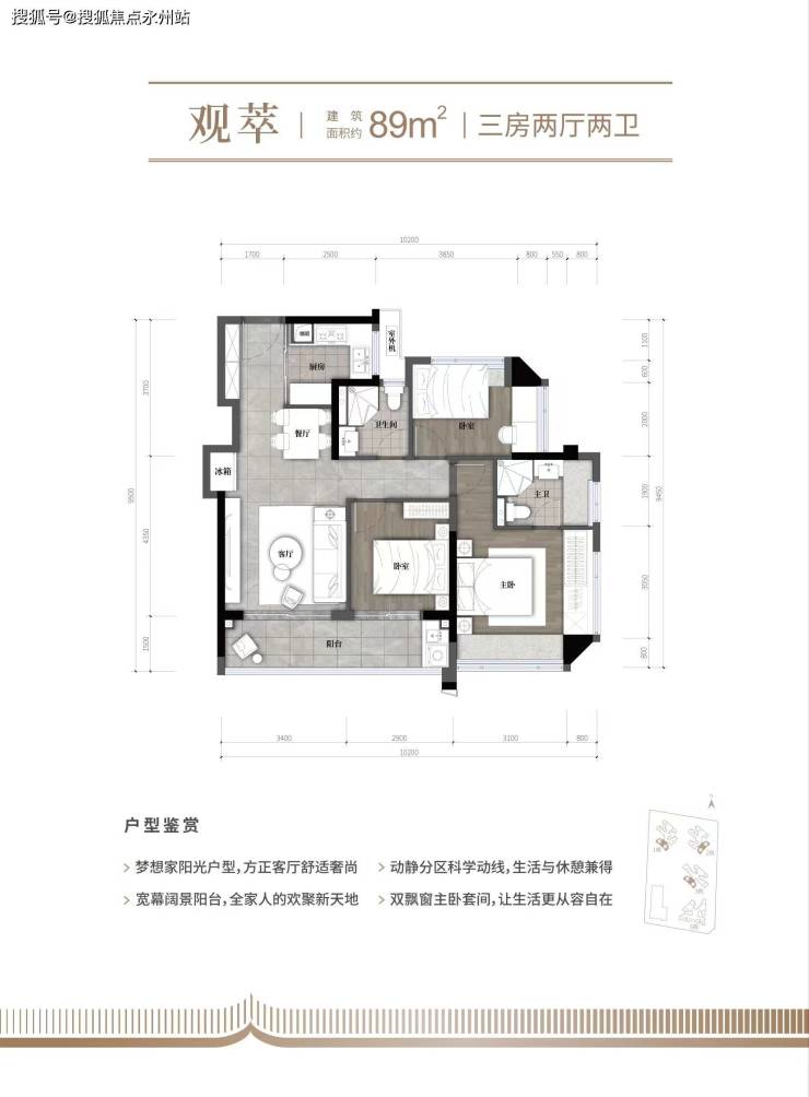89㎡的3房2厅2卫:设计的是竖厅格局,客厅3.4米开间,LDKB一体化,S墙设计预留冰箱卡槽位,3个卧室分别做到了3.9米/2.9米/2.6米的宽度,客厅连接次卧出6.3米长的大阳台,L型厨房,卫生间干湿分离,有西北、西南或东南朝向。