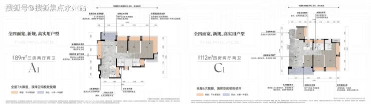 户型结构上无明显槽点,功能间配比、布局也比较合理。其次,它是新规产品,大进深阳台、80公分飘窗、飘窗多、双飘窗卧室等新规特征点蛮多,根据标注尺寸则算含赠送使用率均达95%以上,去除室内墙体后的脚踩面积实用率也能达到90%左右。