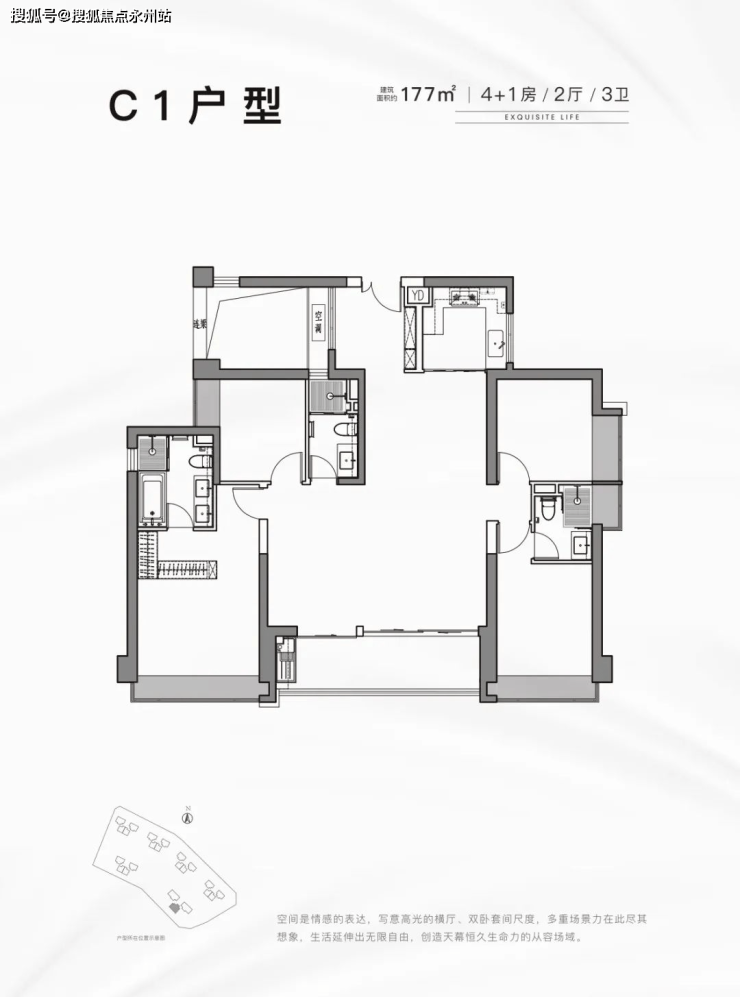 177㎡及185㎡占据整个板块C位,设计了3梯3户大户型,特别是177户型,和185㎡同样作为四房设计,但是这种方正且双龙抱珠户型在东部楼市也很少见,使用功能相当,总价更有优势