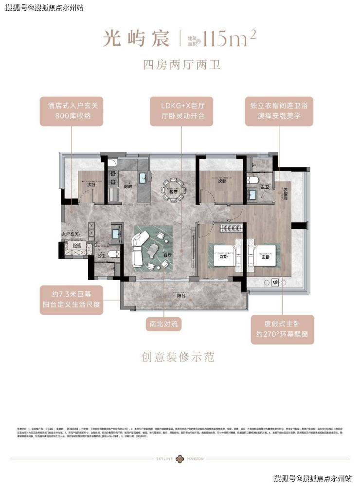 建面115㎡的4房2厅2卫,竖厅南北通透格局:客厅4.45米开间,餐客厅分离设计,分别做到了主卧23.45㎡/次卧8.96㎡/次卧7.84㎡/次卧7.68㎡(实测面积),客厅连接次卧出10.87m²的观景大阳台,L型中式+岛台灵动式厨房,公卫三段式干湿分离,得房率约77.9-79.5%(不含赠送),套内面积91.17㎡,阳台主朝东南或西南向。