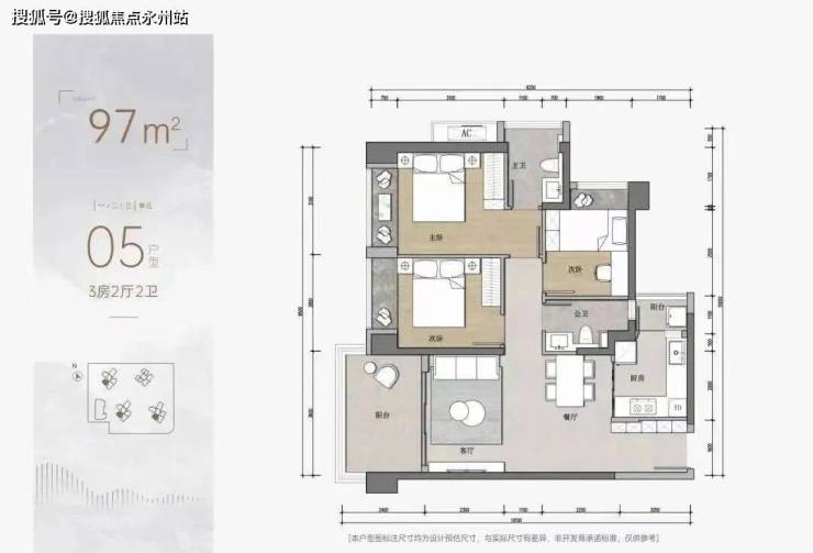 97平3房2卫的户型:客厅开间做到了3.6m而且阳台还不是承重墙,也就是说咱们的客厅还能往外推一些,做一个更大的公区。阳台东南朝向可看小区园林景观,西南侧则可以看到南山的山景景观,采光及通风效果都是非常优质的。