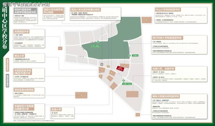 初中学区:深圳实验光明学校(市直属重点)、光明中学(广东省一级学校)、中山大学深圳附属学校(中大附中合作校)。